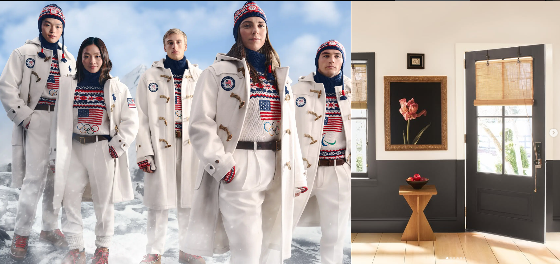 Ralph Lauren chose to use white as the primary color for Team USA’s 2026 Winter Olympics Opening Ceremonies uniforms allowing the red and blue to work together in an intricate pattern without causing tension with the colors in the Olympic Rings. Similarly, Benjamin Moore paired Swiss Coffee with their color of the year, Silhouette (a charcoal brown), to provide a balanced contrast while letting more decorative details shine.